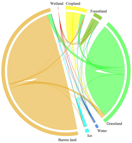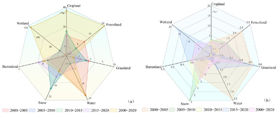 The area of forest land exhibited the second highest growth, with an area increase of 319 × 103 hm2 over the 20-year period, and the dynamic growth rate was as high as 2.29% in 2000–2005, which may be related to the implementation of afforestation and forest protection policies. Meanwhile, the area of wetland increased by only 0.35 × 103 hm2 in 2000–2020, and the areas of grassland, water, bare land, and glacier snow shrank by 1438.64 × 103 hm2, 166.83 × 103 hm2, 73.65 × 103 hm2, and 5.49 × 103 hm2, respectively. Bare land mainly converted to grassland (1103.19 × 103 hm2) and cropland (454.76 × 103 hm2), and its proportion continued to increase from −0.22% in 2000 to 0.22% in 2020, which may be related to land use planning and ecological restoration projects.