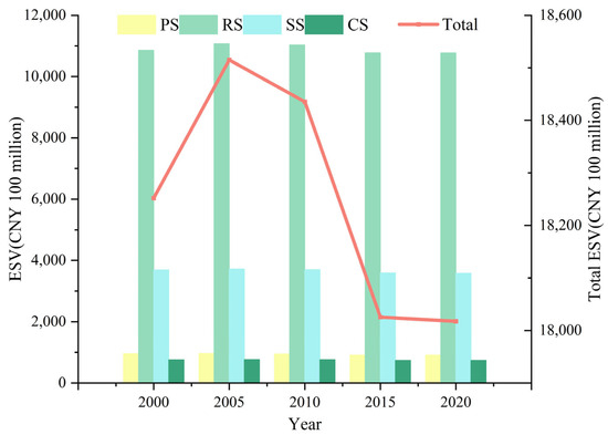 As can be seen in Table 3, regulating services dominate, accounting for about 67% of the total value. Of these services, climate regulation and hydrological regulation contributed the most, accounting for about 48% of the total value. The ESVs of supporting services, provisioning services, and cultural services all showed decreasing trends from 2000 to 2020, declining by CNY 10.389 billion, 4.535 billion, and 1.97 billion, respectively. Despite the decline in the ESV of support services, it was still a significant part of the total value, accounting for about 22%. Among support services, soil and water conservation and biodiversity had larger shares of the value, accounting for about 21% of the total value. Taken together, climate regulation, hydrological regulation, soil conservation, biodiversity, gas regulation, and environmental purification accounted for a large proportion of the total ESV in the study region, with hydrological regulation adding the most value, followed by food production.