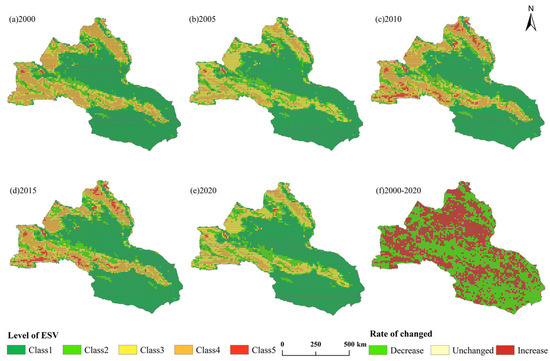 Spatial distribution characteristics of ESV in the northern Tianshans region. (a–e) show the spatial distribution characteristics of ESV classes in the study region for each five-year period from 2000 to 2020, while (f) shows the change characteristics of ESV for the same place and time periods.