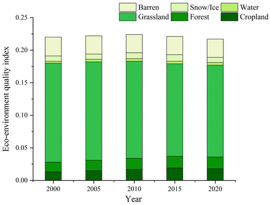 (3) The overall ecological quality of the study region showed a slight downward trend. During 2000–2010, the ecological environment quality index increased from 0.2203 to 0.2237, but afterward decreased by 0.0055. The higher-quality zones were found to be mainly located in the north and southwest of the region. Additionally, the conversion of bare land into grassland and cultivated land, and the transformation of ice and snow into water bodies were the main reasons for the improvement of the regional ecological environment, with a contribution rate of 82.7986%. Meanwhile, the transformation from grassland to bare land and cultivated land caused serious deterioration in the regional ecological environment, with contributions of 62.1154% and 24.1948%, respectively.