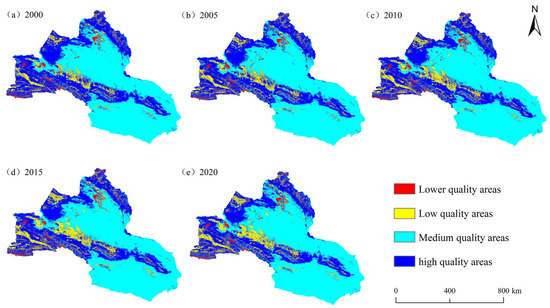 Ecological environment quality was classified into four zone levels according to the natural breakpoint method (Figure 8), as follows: lower-quality zone, low-quality zone, medium-quality zone, and high-quality zone. The spatial distribution of ecological environment quality was primarily medium-quality zone, which was distributed in the central and southern parts of the study region. This zone is dominated by bare land and has a stable ecological environment quality. The high-quality zone was located in the northern and south-western portions of the study region, which is an oasis section dominated by grassland and woodland, with a high level of ecological environment quality. The lower-quality zone was in the watershed section and showed no significant change in ecological quality. The area of cultivated land expanded due to the increase in human activities. In general, the ecological pattern of the whole study area changed little during 2000–2020, and the ecological environment quality tended to be stable.