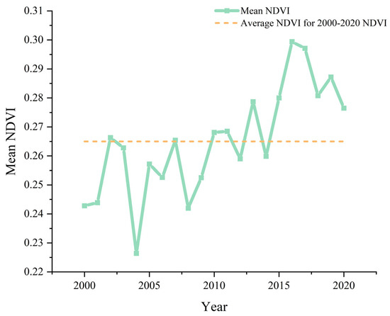 Interannual variation of mean NDVI in the northern Tianshans (2000–2020).