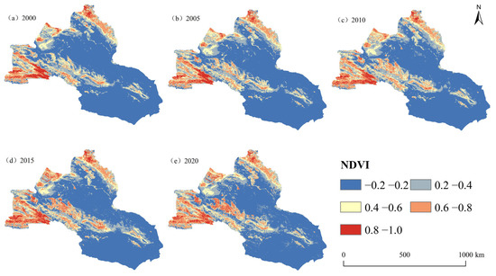 In our study, we divided the spatial variations of the NDVI of natural vegetation in the northern Tianshans into five levels, namely 0 < NDVI ≤ 0.2, 0.2 < NDVI ≤ 0.4, 0.4 < NDVI ≤ 0.6, 0.6 < NDVI ≤ 0.8, and 0.8 < NDVI ≤ 1. Figure 10 shows that the overall spatial characteristics of the changes in vegetation were “high in the north and low in the south”. The high values of the NDVI were mainly distributed in the north and northwest, where there is mostly grassland, and the low values were primarily distributed in the south and center, which features large swaths of desert and bare ground.