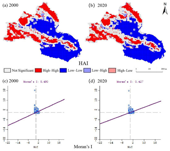 Therefore, this paper explored the spatial intrinsic connection between NDVI∩ESV and ESV∩HAI with the help of the spatial autocorrelation method in order to clarify the effects of changes in vegetation and in the intensity of human activities on the ESV and the spatial differentiation. We found that the value of ecosystem services in the study region showed a significant positive correlation with the NDVI. Moran’s I was greater than 0.5 for the 20-year period, and the correlation between the NDVI and ESV was High-High, which was mainly distributed in High-High zones, and vegetation displayed an increasing trend in the area, further indicating that the abundance of surface water resources under the influence of climate change increased the vegetation area and then increased the ESV.