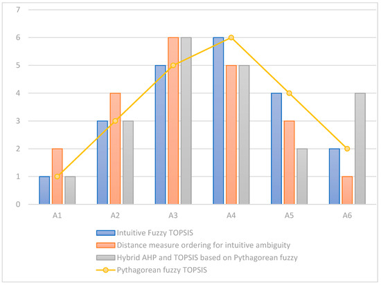 Ashkan et al. [5] constructed an intuitionistic fuzzy environment, determined the criterion weights using the fuzzy sets of expert evaluation, and finally combined them with the TOPSIS method to determine the ranking; in the literature [12], for the Industry 4.0 Green Supplier Selection Problem, Calik used a Pythagorean fuzzy environment with an interval-valued Pythagorean fuzzy AHP to determine the metric weights, and finally used Pythagorean fuzzy TOPSIS to rank the suppliers; in the literature [24], Das et al. [25] established an intuitionistic fuzzy environment and proposed a ranking method based on the metric for interval number distance measure. Using the above three models to recalculate the case of this paper, the ranking results of each scenario are shown in Figure 1.