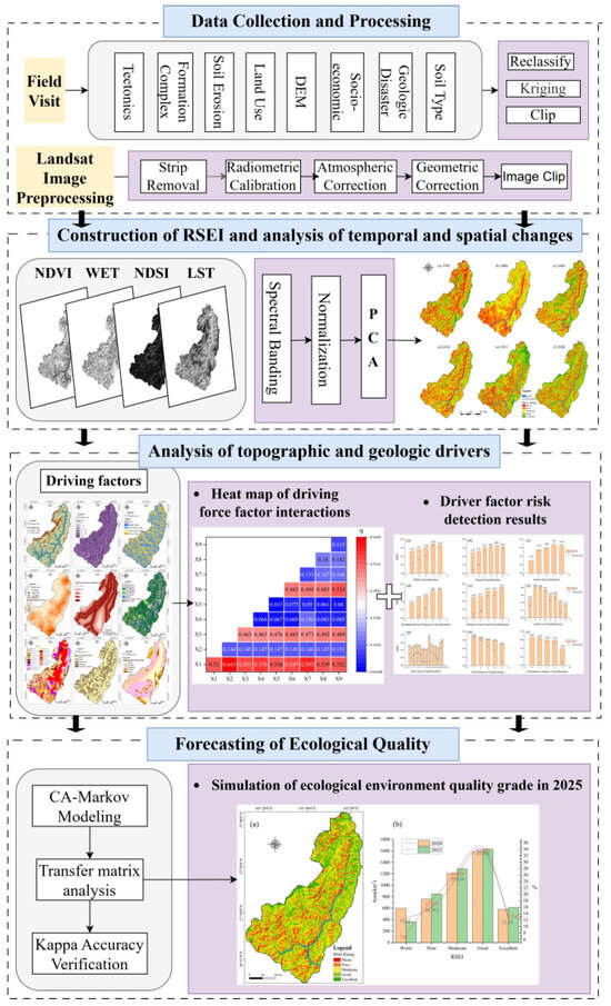 Taking the Ertan Reservoir area as the study area, based on the a priori knowledge of previous researchers and prior studies, three models, namely the RSEI model, GeoDetector, and CA-Markov, were used to realize the study of the spatial and temporal evolution of the ecological environment quality, the study of the driving force of topographic and geological impacts, and short-term prediction of the ecological environment, respectively. Specifically, the four aspects of data collection and processing, RSEI model construction, spatial and temporal evolution of the ecological environment quality and driving force analysis, and ecological environment quality prediction were carried out (Figure 2).