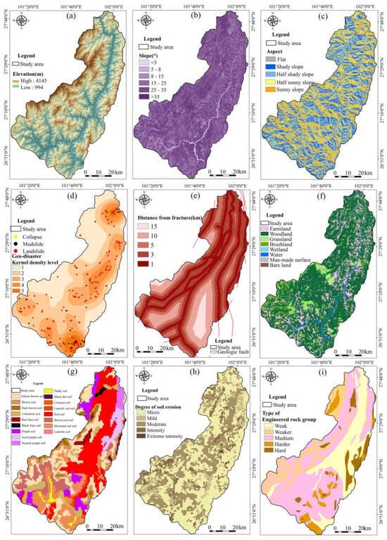 Ecosystem quality drivers. (a) DEM; (b) slope; (c) aspect; (d) geo – hazard kernel density; (e) distance from fault; (f) land use; (g) soil type; (h) soil erosion; (i) formation complex.