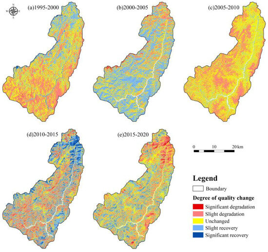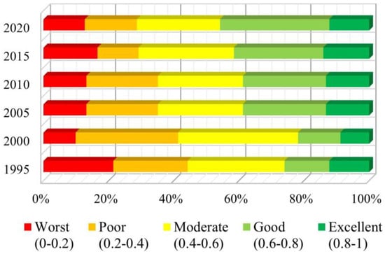 Generally speaking, from 1995 to 2020, the only areas with an increase in the area share were those with a grade of “Good”, with a total increase of 937.18 km2, and an increase of 19.83% in area share, while those with a significant decrease in area share were those with grades of “Worst”, “Poor”, and “Moderate”, with a decrease of 414.56 km2, 322.33 km2, and 199.53 km2 respectively, and a decrease of 8.77%, 6.82%, and 4.22% respectively, while the area of “Excellent” areas remained basically unchanged.