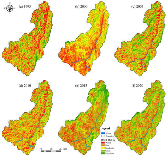 The statistical standard normalized remote sensing ecological index (Figure 9) showed that the average values of the RSEI in 1995, 2000, 2005, 2010, 2015 and 2020 were 0.51, 0.55, 0.61, 0.55, 0.62, and 0.63, and the standard deviation tended to be stable in the range of 0.09–0.14. The remote sensing ecological index RSEI of the Ertan Reservoir area showed a trend of “rising-declining-rising” from 1995 to 2020, in which the RSEI index increased by 18.98% from 1995 to 2005, decreased by 9.87% from 2005 to 2010, and steadily increased by 9.87% from 2010 to 2020. During the period of 1995–2005, the RSEI index increased by 18.98%; during the period of 2005–2010, the RSEI index decreased by 9.87%; and during the period of 2010–2020, the RSEI index increased steadily by 15.69%. Over the 25-year period, the RSEI index of the Ertan Reservoir area showed a general upward trend.