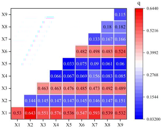Heat map of driving force factor interactions. DEM (X1), slope (X2), aspect (X3), geohazard kernel density (X4), distance from faults (X5), land use (X6), soil type (X7), soil erosion (X8), and formation complex (X9).