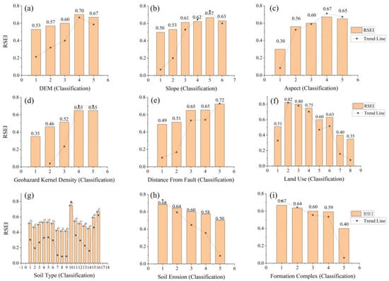 Overall, the factors positively correlated with the RSEI values were elevation, slope, and aspect. The factors that were negatively correlated with the RSEI values were geohazard kernel density, distance from faults, soil erosion, and formation complex, while the land use and soil type needed to be categorized to find the relationship; the more vegetation in the area, the more fertile the soil, and the higher the humidity, the higher the RSEI value; and the area where there were mostly bare rocks and lower humidity, the lower the RSEI value.