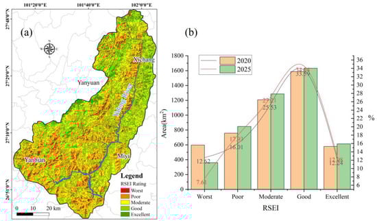 According to the spatial distribution comparison map of RSEI classes in 2020 and the results of accuracy verification, except for the spatial simulation results on the RSEI class “Worst” with relatively large errors, the spatial simulation results of other RSEI classes were good, and the global kappa coefficient of the CA-Markov model of the Ertan Reservoir area reached 0.835, which was in the category of high-precision. This proved that the model was suitable for RSEI dynamic simulation in the Ertan Reservoir area, and its results maintained good consistency both in quantitative accuracy and spatial scale. Therefore, in this study, taking 2020 as the base period, with the 2015–2020 transfer area probability matrix as the conversion criterion, and setting the number of iterations as 5 years, the distribution of RSEI classes in the Ertan Reservoir area in 2025 was obtained by extrapolating based on the CA-Markov model (Figure 12).
