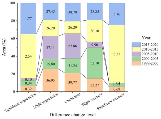 It can be seen that before the completion of the Ertan Reservoir (1995–2000), the ecological degradation of the reservoir area accounted for 37.27%, the ecological restoration accounted for 22.96%, and the degraded area accounted for a larger proportion. And after the completion of the reservoir (2000–2005), the degraded area accounted for 16.13%, which was significantly reduced compared with the previous period; the ecological restoration area accounted for 52.63%, and the ratio of the degraded area to the restored area was 0.31, which indicated that the ecological restoration area increased and the ecological environment was significantly improved after the Ertan Hydropower Station had been impounded for a period of time (Figure 14). The results of this phase of this study are the same as those of Zhang [46] and Pang [47], who monitored the ecological environment of the Ertan Reservoir area from 1988 to 2003, and the results showed that the construction of the Ertan Project changed the ecological and geological environment of the reservoir area to a certain extent, and the overall trend was benign. Pang mainly conducted dynamic monitoring of land use changes in the Ertan Reservoir area, and the results showed that after 2000, the area of ecological land in the Ertan Reservoir area increased, and the quality of habitats improved significantly.