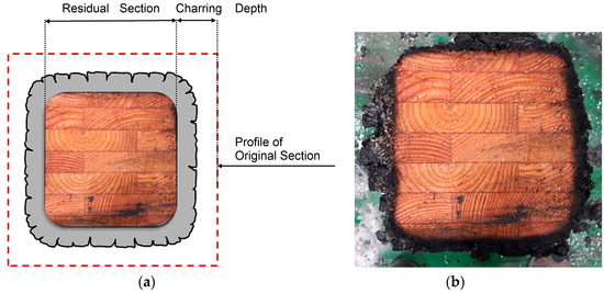 According to a study conducted by Buchanan and Abu [6], when the wood is exposed to a fire and the temperature rises above a certain level, burning occurs, and when the cross-sectional width () × length () of the timber is reduced by the fire on the remaining section, × , the charring depth of the exposed section is given by Equation (1), below: