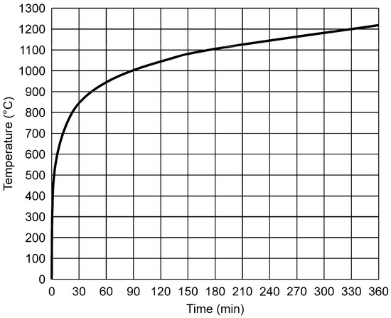 For the fire temperature curve, the standard time–temperature curve (ISO 834-1) [12] was used, and the charring depth of the samples and displacement during the load-bearing tests were measured. Figure 3 shows the standard time–temperature curve (ISO 834-1) [12].