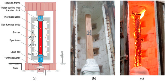 Design concepts for fire-resistant timber members: (a) column fire test in furnace, (b) sample before fire test, and (c) sample after fire test.