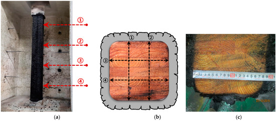 Charring depth measurement of sample: (a) measurement location after fire test, (b) charring depth measurement point, and (c) charring depth measurement.
