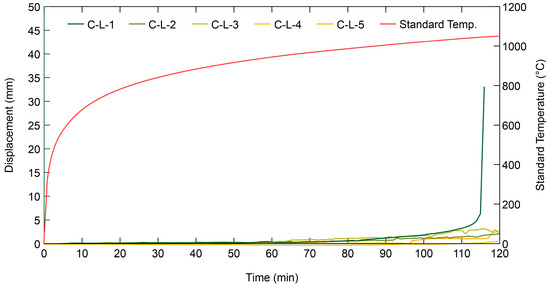 The load-bearing fire tests were conducted for 120 min. Only sample C-L-1 exceeded the performance criterion at 117 min and showed fire resistance up to 116 min. The remaining samples all satisfied the criteria for load-bearing fire resistance for 120 min.