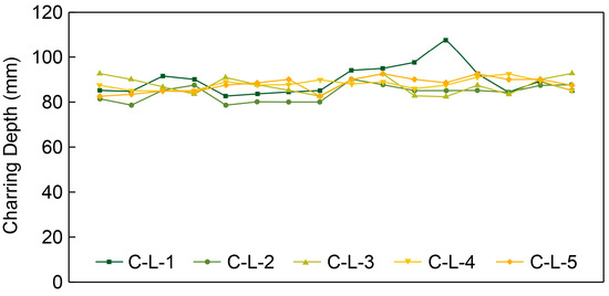 Figure 7 shows the charring depth measured at 16 locations in each of the load-bearing fire test samples. Here, only C-L-1, which did not have satisfactory fire resistance, shows local variations in charring depth. In other samples, the charring depth shows consistent behavior at every location. Specimen C-L-1, which had the highest load ratio of 1.3, experienced delamination of the carbon layer due to the applied load during the fire resistance test. Consequently, a new heating surface was formed in the area where the carbon layer was removed, and additional carbonization occurred. Therefore, the graph shape shown in Figure 7 appeared owing to the uneven carbonization thickness caused by the load.