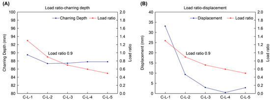 Behavior of samples by load ratio: (A) load ratio-charring depth, and (B) load ratio-displacement.