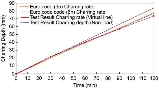 Since the results for samples manufactured using South Korean larch were measured values and did not account for any safety factors, they were similar to the charring rate suggested in the Euro code. Figure 9 compares the test results with the Euro code.