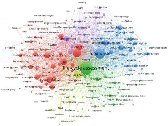 Figure 1 displays a network visualization based on the titles, abstracts, and keywords of selected 1598 articles for the selected keywords. It shows five clusters presented in different colors. The red cluster mainly deals with the environment in terms of LCA of food, GHG, and various environmental impacts. The green cluster outlines the processing and usage of biomass, biofuels, and bioenergy. The blue cluster is related to different types of bio-waste (bio-waste, kitchen waste, and food waste) and mechanisms of solving this environmental issue, such as processing sludge or anaerobic digestion. The yellow cluster is dedicated to the value chain covering the extraction of proteins from waste or composting. Finally, the purple cluster is deployed to waste management (solid or municipal waste) and conversion of waste to energy.