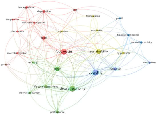 Figure 2 depicts the network visualization of selected 129 manuscripts for the selected keywords. It reveals four clusters as follows: the red cluster focuses on different processing methods of the waste such as biodegradation, upcycling of mechanical properties, or anaerobic digestion; the blue cluster is related to improving the waste value chain in terms of analysis of bioactive compounds and use of the different antioxidative method; and the yellow cluster is related to sustainability while the green cluster focuses on LCA and circular economy.