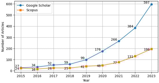 Furthermore, the consistent annual increase in number of academic articles published within the intersecting fields of AI and sustainable logistics reflects a growing research interest. As Figure 1 shows, over recent years, the number of articles including the terms “artificial intelligence” and “logistics” has experienced a noticeable increase in databases such as Google Scholar or Elsevier Scopus.