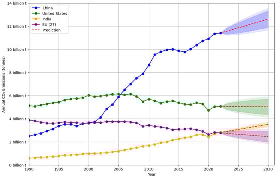 Climate action (SDG 13) calls for urgent measures to combat climate change and its impacts. Carbon dioxide emissions are a major contributor to global climate change. According to data from Our World in Data (https://ourworldindata.org/, accessed on 17 October 2024), global CO2 emissions from fossil fuels and industry have reached a total of billion tonnes. Figure 2 illustrates the annual CO2 emissions from the following four major regions: China, the United States, India, and the European Union (EU), spanning from 1990 to 2022. Projections until 2030 were generated using Holt’s double exponential smoothing, a method specifically designed for time series data that exhibit a trend but lack seasonality [24]. The data reveals several important points, as follows:
