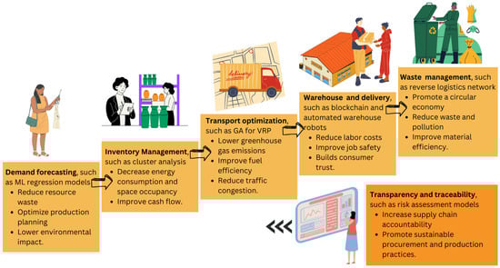 Emergencies such as COVID-19 provided new objectives for logistics systems in order to meet various economic needs in times of crisis and uncertainty. Companies utilize AI-based innovations to provide a wide range of solutions that allow them to address the complexity of activities, increase efficiency, and ensure sustainable financial growth and resource utilization [33,53]. AI and, in particular, ML help supply chain operators to quickly make informed decisions on streamlining processes and quickly identifying inefficiencies, in order to reduce them [18,54]. Furthermore, organizations that use AI-driven technologies to optimize aspects of the supply chain, such as demand forecasting, energy management, and waste reduction, can improve operational efficiency while achieving cost savings and a reduced ecological footprint [34]. The benefits of AI-driven demand forecasting, customer behavior analysis, and supply chain network design support more rational production planning, purchasing, inventory management, and transportation scheduling, directly easing environmental strain. AI-driven forecasting also reduces the need for excessive safety stock, particularly for perishable items. Additionally, economies of scale from bundling goods promote a shift to more eco-friendly transportation modes. By refining supply chain networks, AI further boosts transportation efficiency, directly reducing environmental impacts [33].