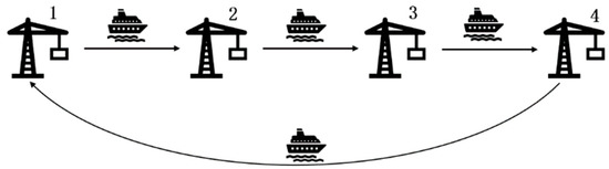 Consider a container liner route consisting of ports, such that , where and indicate the port serial number. The route of a container liner can form a loop between ports, which can be represented by the sequence . In liner transportation, fixed routes, fixed ports, fixed shipping dates, and relatively fixed rates are observed, and any detour will cause a loss of income while wasting time. Therefore, in order to avoid the detour problem of port 4 → port 3 in the liner route loop, a set is established, which includes all available port pairs in the route. Therefore, is used to represent the number of all available port pairs in the route. The route between two adjacent ports is denoted as one segment, and all segments on the route are represented by the set . A membership index is introduced that takes a value of 1 for the route segments between the port of origin and the port of destination, and 0 otherwise.