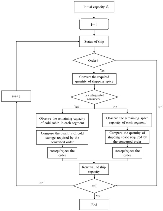 In Figure 2, we show the decision-making process of dynamic planning for flexible slot allocation. In stage , the presence of customers is first determined, followed by the decision on whether to accept the order based on the remaining quantity of dry and reefer slots. The remaining slot quantity is adjusted according to the decision ready for the next stage, and this process continues until all the slots are booked or the predetermined time ends.