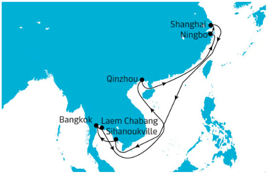 Schematic diagram of liner routes. (From: https://www.maersk.com.cn/, accessed on 1 April 2024).
