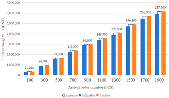 Employing identical sample order data, the optimal objective function values for both the flexible and inflexible slot allocation models were compared and the results are presented in Figure 4. The comparison revealed an increase in total revenue value with an increasing number of orders received, confirming the feasibility of both models. In addition, the results also prove that the profit of the liner enterprises considering flexible shipping slot allocation is higher than that of the liner enterprises without flexible shipping slot allocation, and the difference is large. Therefore, for enterprises, using the flexible model to allocate shipping slots in actual operations can improve earnings and bring higher profits.