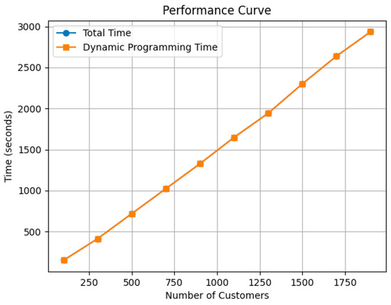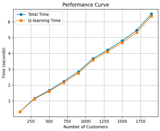 In Figure 5 and Figure 6, blue symbol represents the overall operation time, and orange symbol represents the solution time. The difference represents the time it takes the algorithm to generate the examples. In Figure 5, due to the long calculation time, the time to generate the example is covered in the figure. As can be seen in Figure 5 and Figure 6, the solving time of the two algorithms will increase significantly with increasing numbers of customers. However, under the same example, the Q-learning algorithm has a faster solving speed and a greater advantage in solving efficiency.