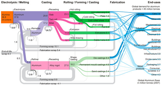 - Cullen, J.M.; Allwood, J.M. Mapping the Global Flow of Aluminum: From Liquid Aluminum to End-Use Goods. Environ. Sci. Technol. 2013, 47, 3057–3064. [Google Scholar] [CrossRef] [PubMed]