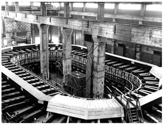 Picture of the Alpha Calutron track at the Y-12 Plant in Oak Ridge, TN, USA, that was used in part to perform U isotope separation for the Manhattan Project [35].