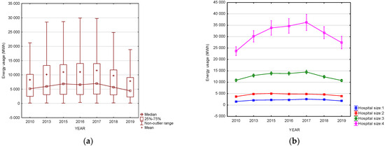 Figure 8a describes the distribution of energy consumption per hospital bed across Polish hospitals for each year from 2010 to 2019.