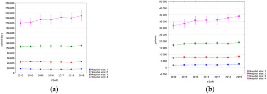 In order to analyze how the hospital size and its activity changed between 2010 and 2019 and to what extent these variables depended on the size of the hospital in the first stage, we presented the hospital size and activity by four hospital categories. The size of the hospitals was described by the number of beds, operation rooms, doctors, nurses, and fixed assets value. The fixed asset value was converted from PLN to euro at the PLN 4.23 per euro exchange rate. Hospital activity was measured by the number of person-days, patients, and operations. Means and SDs were calculated for all data. Variables were compared using Student’s t-test. A p-value of 0.005 was considered significant. Statistical analysis was carried out using StatSoft Statistica software version 13.3.