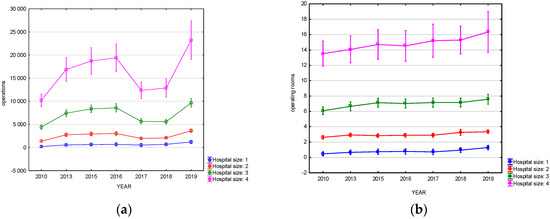 The number of operations (a) and operating rooms (b) in hospitals by size in 2010–2019.
