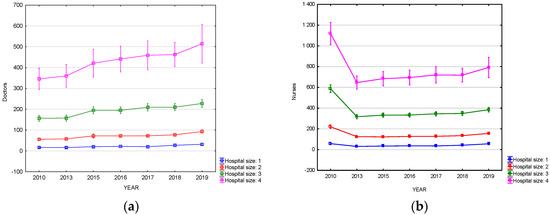 The number of doctors (a) and nurses (b) in hospitals by size in 2010–2019.