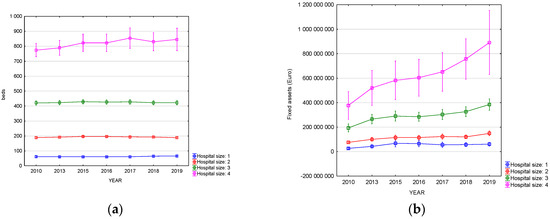 The number of beds (a) and fixed assets value (b) in hospitals by size in 2010–2019.