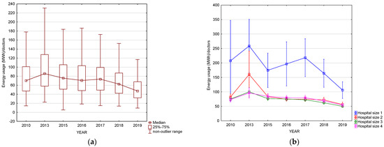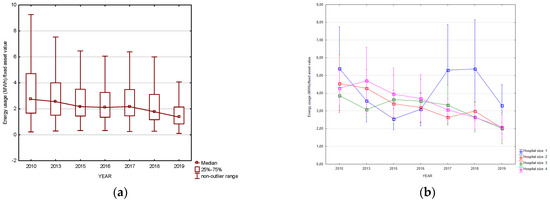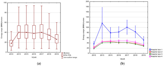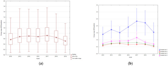 Energy consumption per number of beds by hospitals in 2010–2019: (a) hospitals total; (b) by hospital size.
