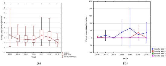 Energy consumption per operating room by hospitals in 2010–2019: (a) hospitals total; (b) by number of beds.