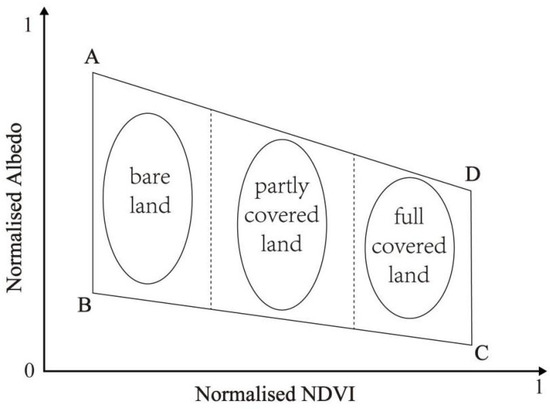 Albedo–NDVI feature space plot. Note: A is dry bare soil (low NDVI and high albedo), B is water-rich bare soil (low NDVI and low albedo), C is high vegetation coverage and sufficient soil water content (high NDVI, and low albedo), D is high vegetation coverage, low soil water content and relatively high albedo (low NDVI, high albedo) (adapted from Ji et al. [35]).