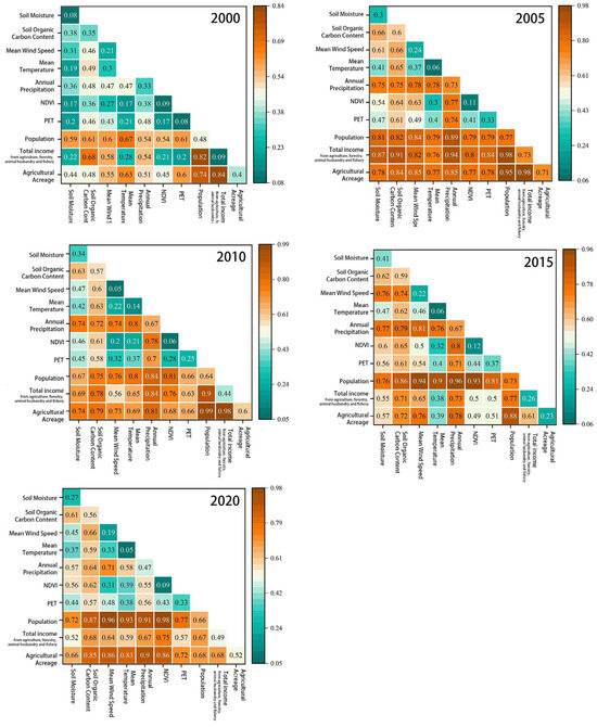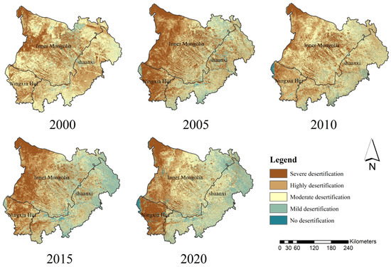 In order to determine the changes in the Małosu Desert in time and the data needed for the subsequent exploration of the influencing factors, the years 2000, 2005, 2010, 2015 and 2020 were selected to evaluate the changes in the desertification situation in the Małosu Desert in time, based on their importance in reflecting key stages in the development of economic and environmental policies, and the availability of data for the study. These years reflect important changes in the socio-economic landscape, including the implementation of major policies that may have influenced the trends we are analyzing.