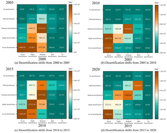 To explore the changes and trends of the Mu Us desert in different desertification areas between 2000 and 2020, we used the transfer matrix to determine the change areas of the Mu Us desert at different stages. The transfer matrix can comprehensively and specifically analyze the quantitative conversion and change structure of various land use types over a period of time [45], and its mathematical expression is as follows: