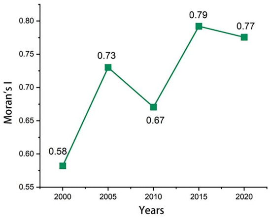 The Global Moran’s I Statistic is a rational number that is normalized to [−1, 1] after variance normalization. > 0 indicates positive spatial correlation, and the larger the value, the more pronounced the spatial correlation; < 0 indicates negative spatial correlation, and the smaller the value, the larger the spatial variance, or else = 0, where the spatial relation is stochastic.