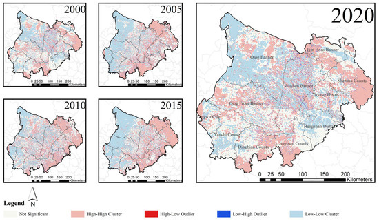 Desertification has gradually improved in Shaanxi and Inner Mongolia, while it has continued to worsen in Ningxia. Between 2000 and 2020, the spatial distribution of desertification exhibited a significant positive spatial correlation, indicating that regions with similar types of desertification, particularly low-desertification areas, are gradually becoming more concentrated. In 2000, highly desertified patches were densely distributed in the northern part of Inner Mongolia’s Otog Banner. From 2000 to 2005, these patches expanded to cover much of Otog Banner, Otog Front Banner, Lingwu City, and Yanchi County. However, between 2005 and 2020, the area of highly desertified patches shrank significantly, and low-desertification patches transformed from a scattered to a uniform distribution, gradually providing conditions for regional restoration measures.