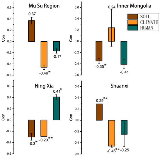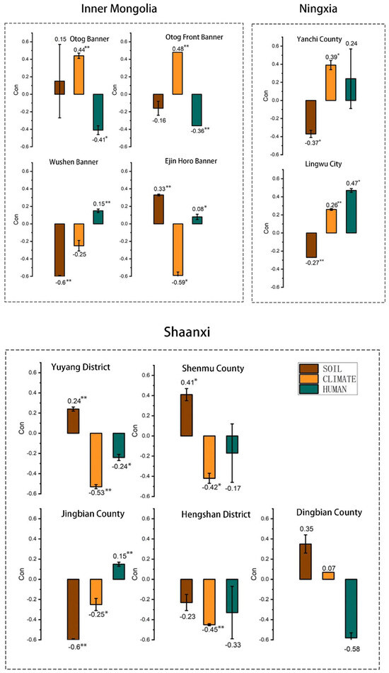Human activities have played a significant role in mitigating desertification, particularly through planned ecological restoration measures and sustainable land use practices. Based on the principal component analysis from 2000 to 2020, it is evident that targeted human interventions have led to significant improvements in desertification levels in various regions. For example, in Otog Banner (=−0.41, p < 0.05), Otog Front Banner (=−0.36, p < 0.01), and Dingbian County (=−0.25, p < 0.05), human activities have effectively reduced desertification rates. These regions have benefitted from a series of well-executed initiatives, such as effective land management, vegetation restoration, and water resource optimization, which have contributed to increased ecological stability and productivity [56]. Planned ecological restoration has been particularly successful in regions with relatively light desertification but fragile ecosystems, such as Dingbian County, Otog Banner, and Otog Front Banner. In these areas, human intervention has focused on restoring vegetation and improving land-use practices, which have greatly contributed to reducing the spread of desertification. These interventions have not only curbed further degradation, but have also enhanced the resilience of the local ecosystems to external environmental changes [61]. On the other hand, in areas such as the Ningxia Hui Autonomous Region, human activities have exacerbated desertification in recent years, with poor land management practices leading to significant ecological degradation. According to the principal component analysis, current activities in Ningxia, such as overgrazing and improper agricultural practices, have accelerated desertification. This indicates that not all human interventions are beneficial, and that poorly executed or unsustainable practices can have adverse effects on the environment. Large-scale restoration efforts in this area are needed, but may come at a higher cost due to the extent of desertification [62].